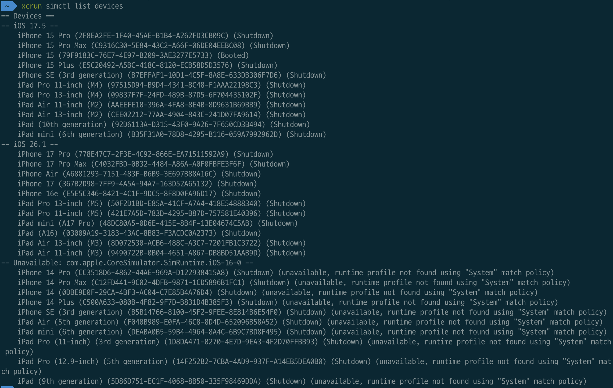 나의 경우 iPhone 15로 개발하고 있었기 때문에 15에만 (Booted) 라고 표시되는 것을 볼 수 있다.