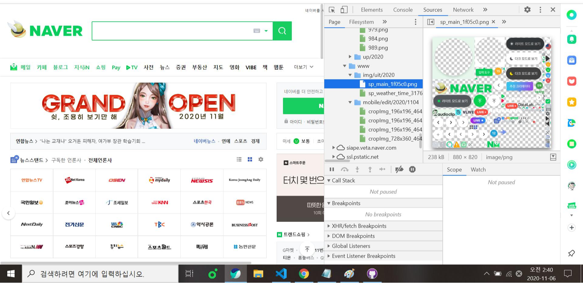 - console 창에서 document.head.parentNode.removeChild(document.head); 해서 헤드 없애면 css 사라지니까 네이버의 순수 html 뼈대를 확인할 수 있다.